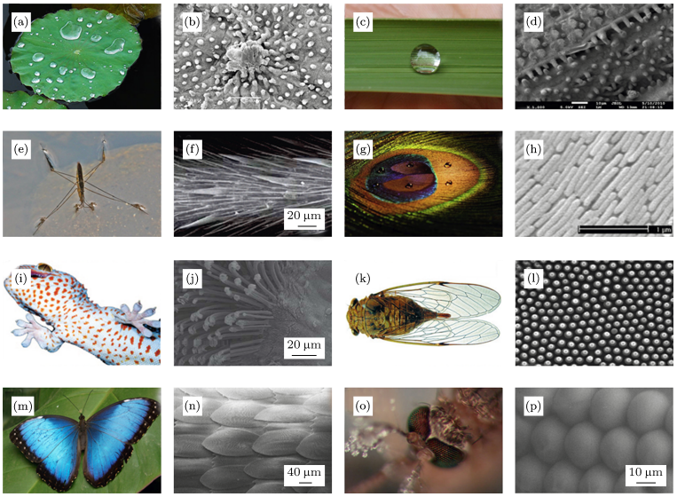 图 自然界中具有超疏水性的动植物及其扫描电镜图 (a, b) 荷叶; (c, d) 水稻叶; (e, f) 水黾腿;(g, h) 孔雀羽毛;(i, j) 壁虎脚掌 ; (k, l) 蝉翼 ; (m, n) 蝴蝶翅膀 ; (o, p) 蚊子复眼