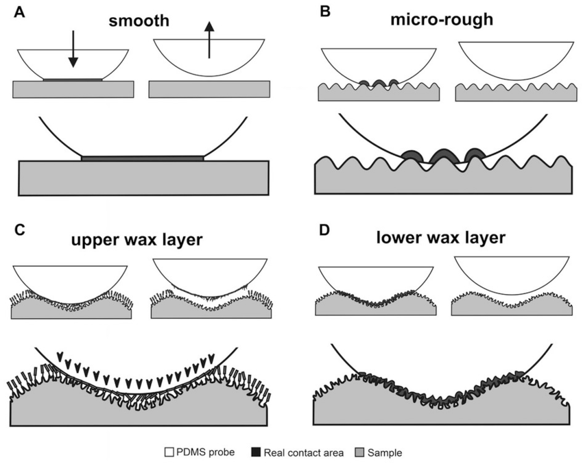 如果把视角从液滴转向两个固体之间的接触,问题就转化为黏附与分离。黏附力来源于界面分子之间的相互吸引,但宏观表现往往受到接触面积与形貌的调制。理想光滑表面在理论上可以实现较大真实接触面积,但实际材料总存在微观凸起与凹陷,使真实接触点分散在局部区域。